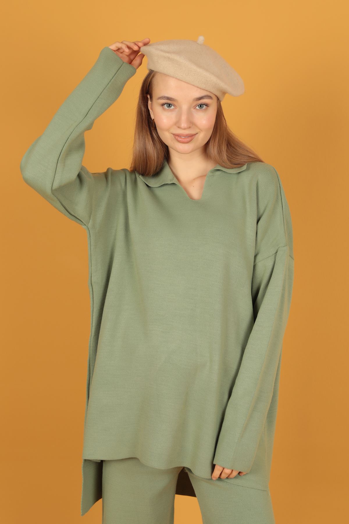 طقم نسائي تريكو بياقة القميص-اخضر فاتح