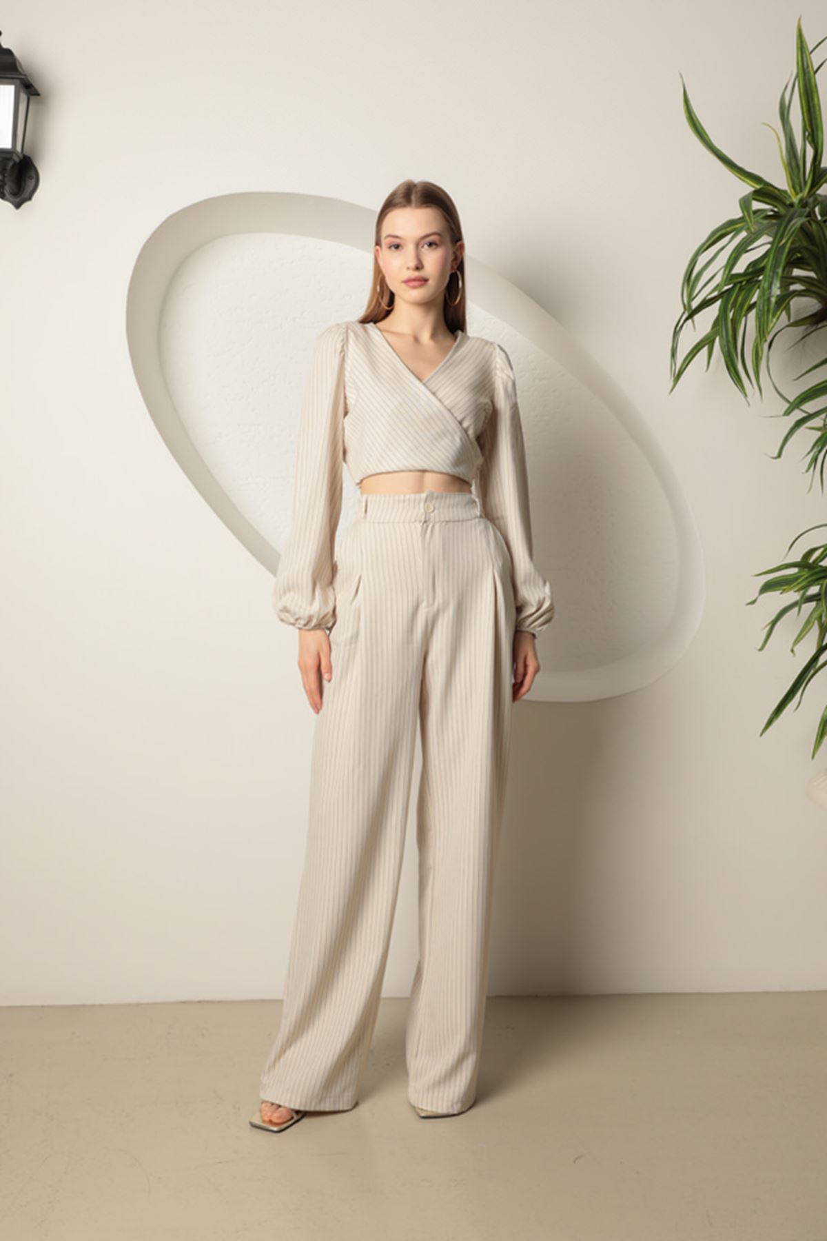 طقم بلوزة مخططة وبنطلون واسع الساق-بيج
