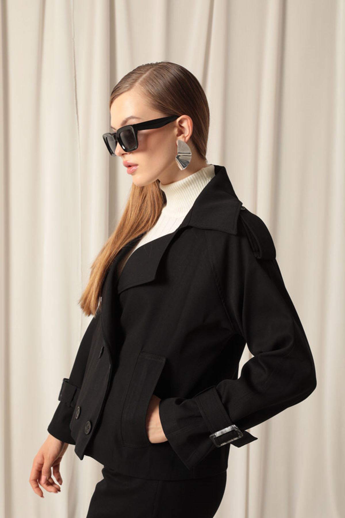 معطف واق من المطر قصير من القماش المنسوج للنساء باللون الأسود