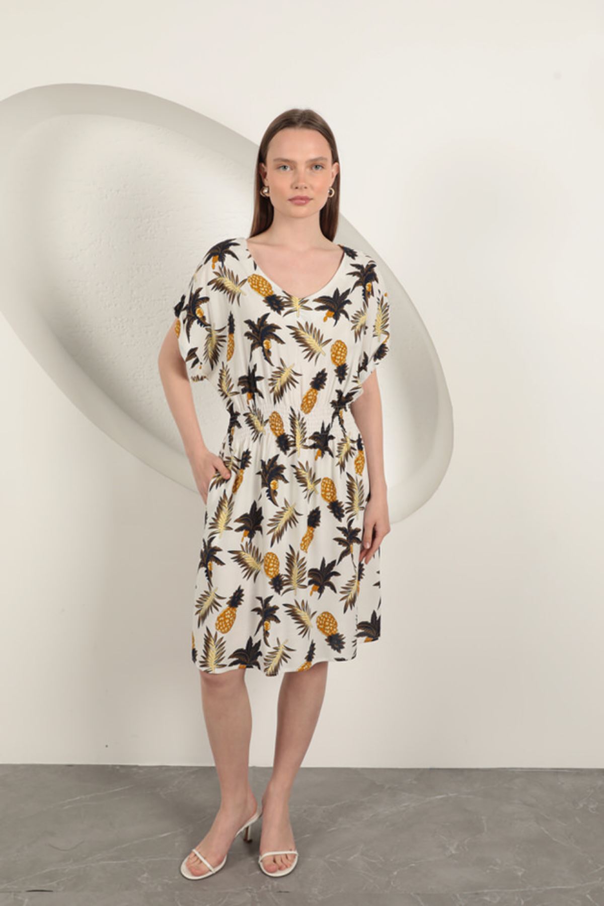 فستان من الفيسكوز بنقشة الأناناس - بيج فاتح