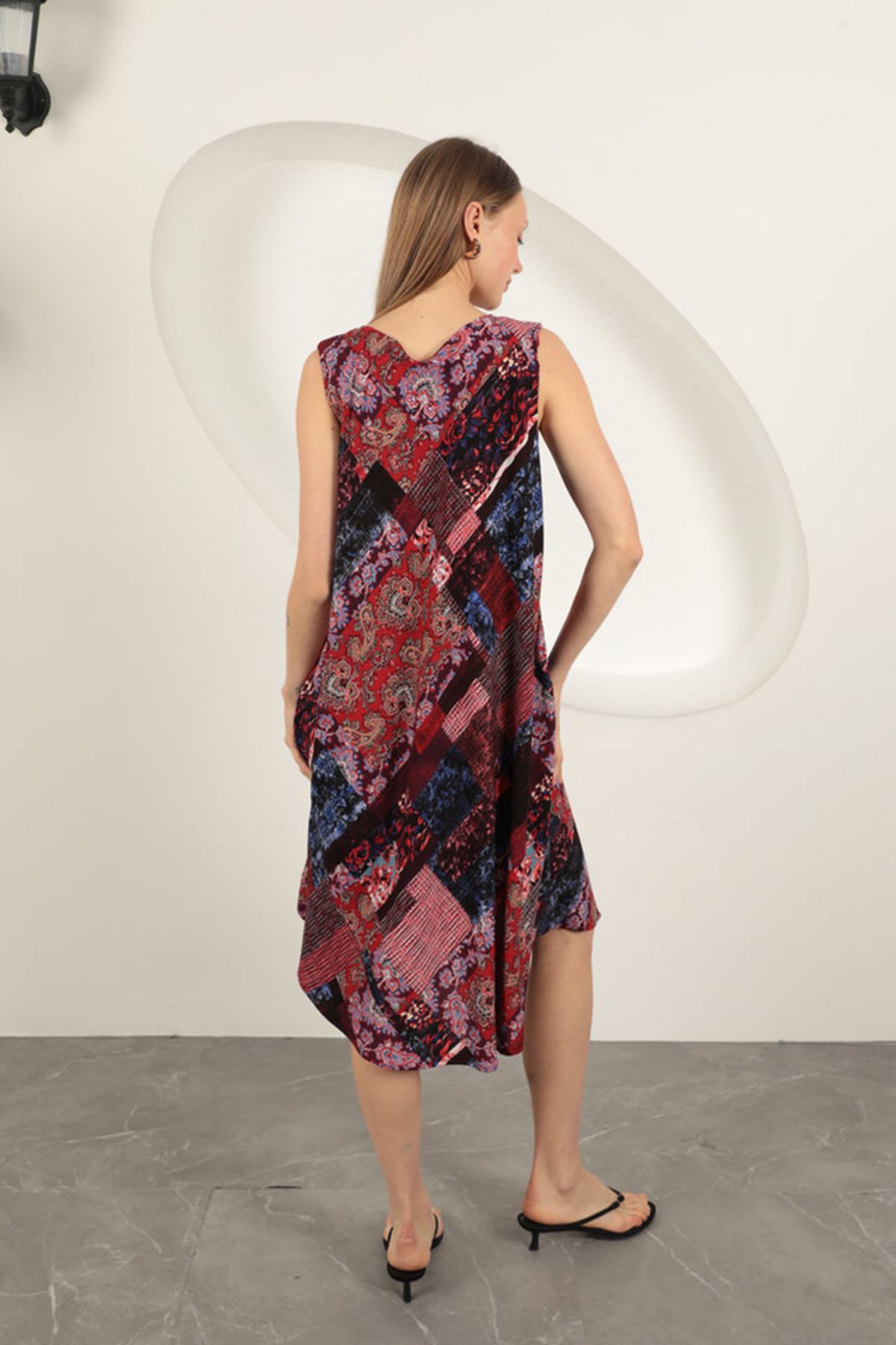 فستان من قماش الفيسكوز بنقوش عرقية - عنابي