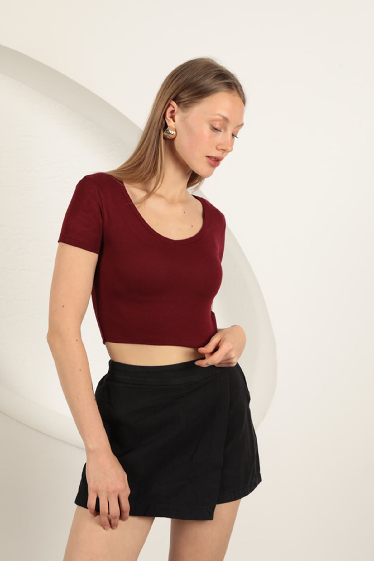 تي شيرت أساسي برقبة على شكل حرف V - لون عنابي