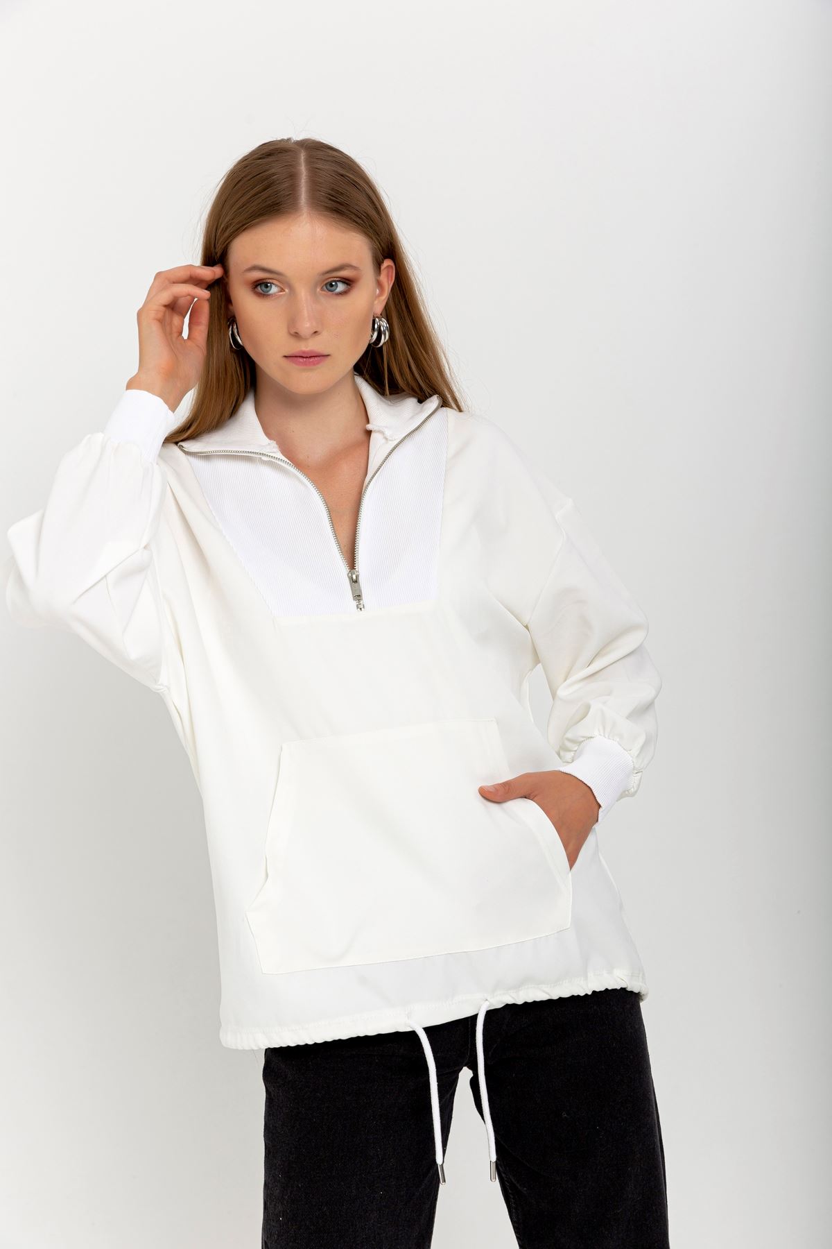 Atlas Fabric Zip Neck Hip Height Kangaroo Pocket Women Sweatshirt - Ecru