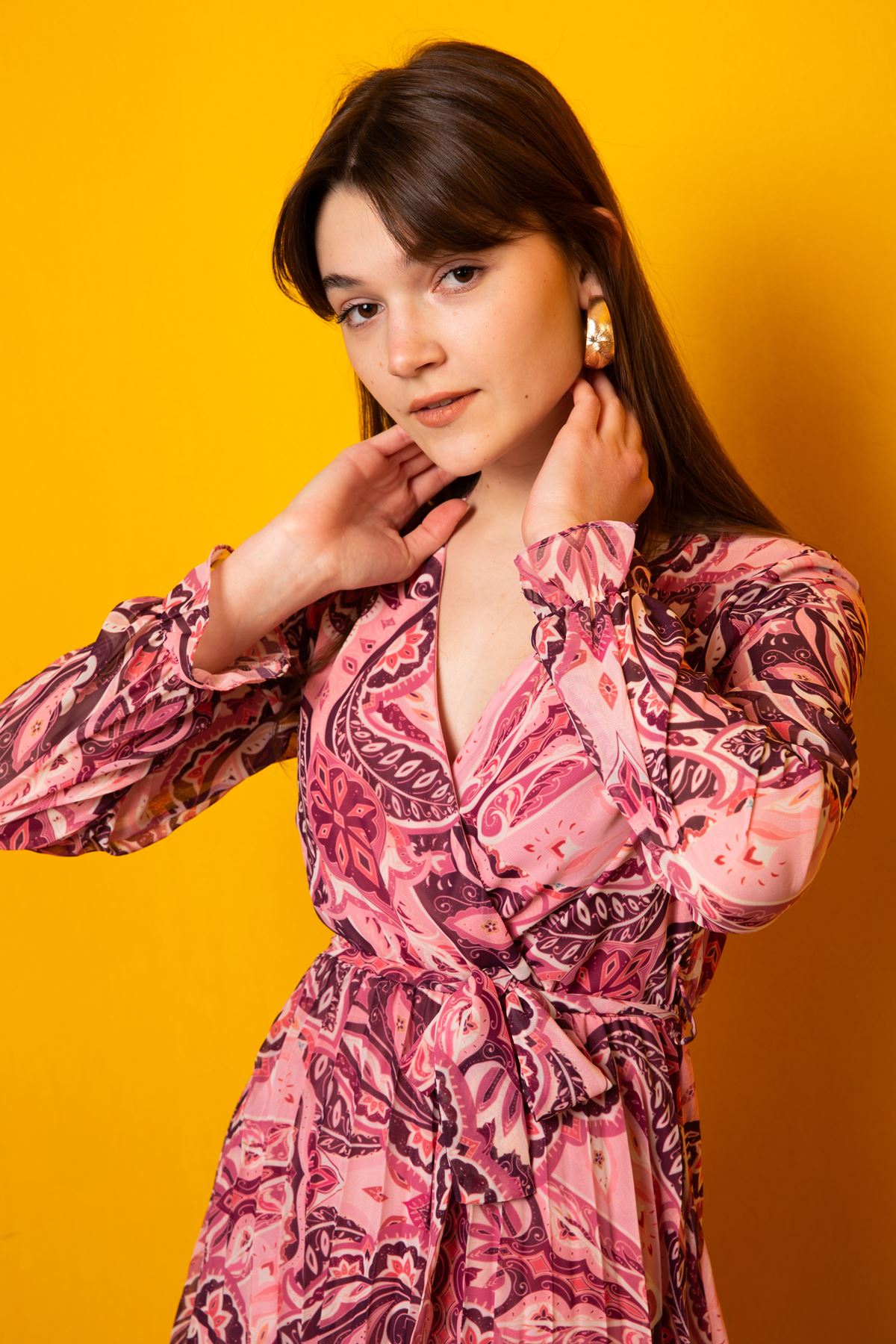 Chiffon Fabric Band Neck Shawl Pattern Women Dress - Pink
