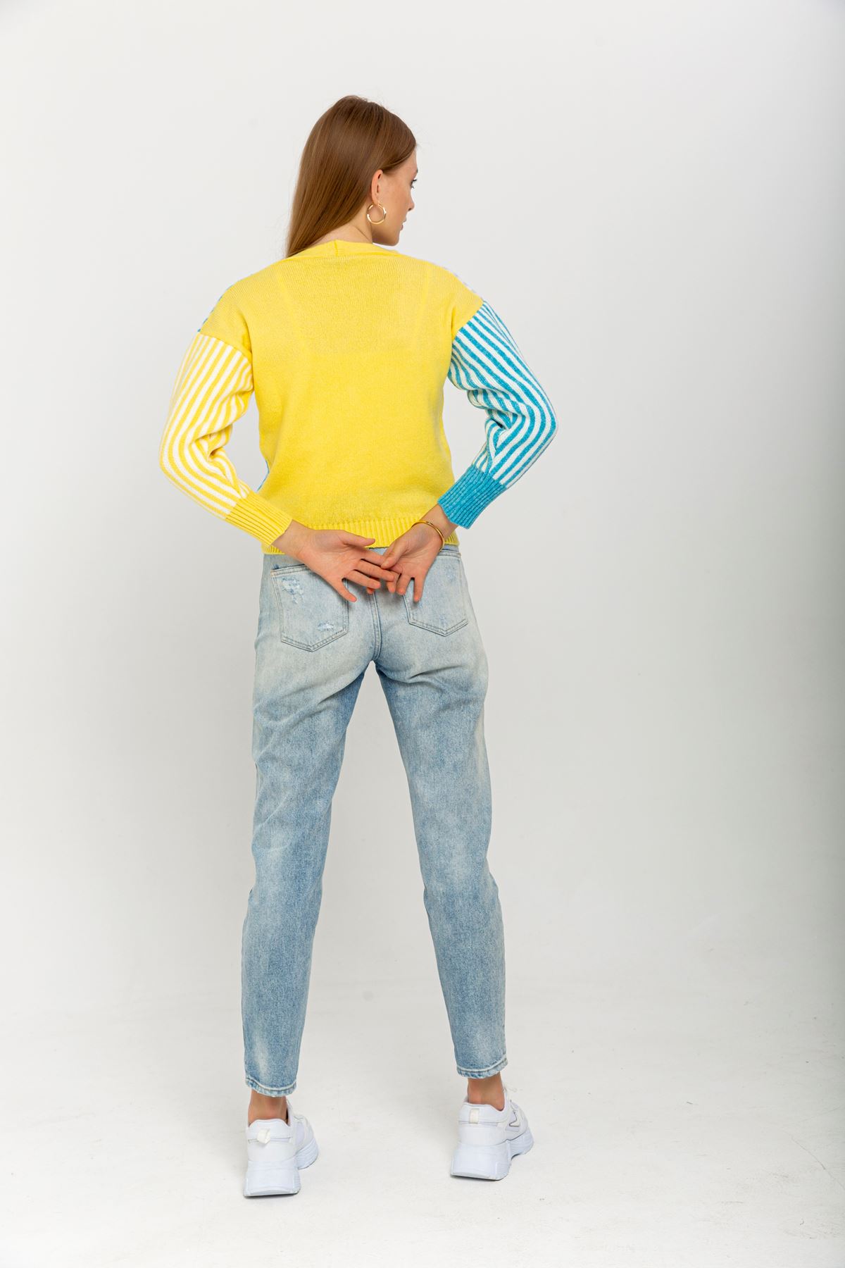 Knitwear Fabric Long Sleeve V-Neck Short Striped Women Cardigan - Yellow