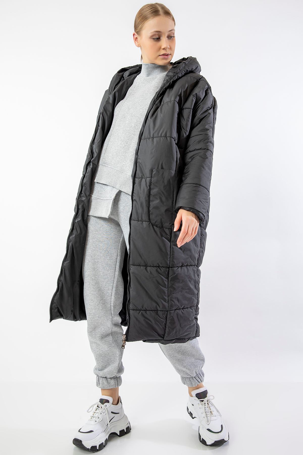 Quilted Fabric Long Sleeve Hooded Below The Knees Boyfriend Women Coat - Black