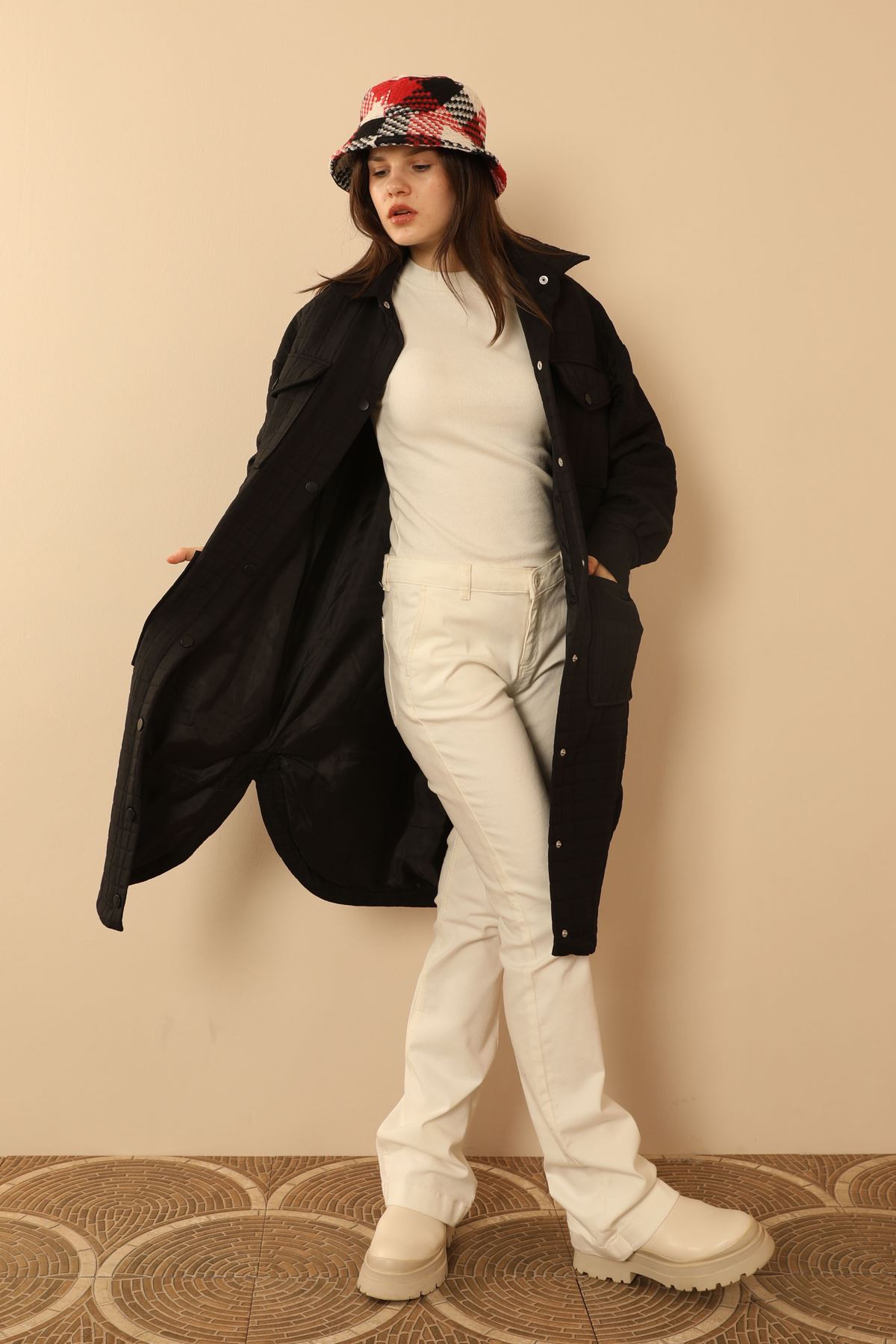 Jakar Kumaş Büyük Kare Uzun Oversize Kadın Gömlek-Siyah