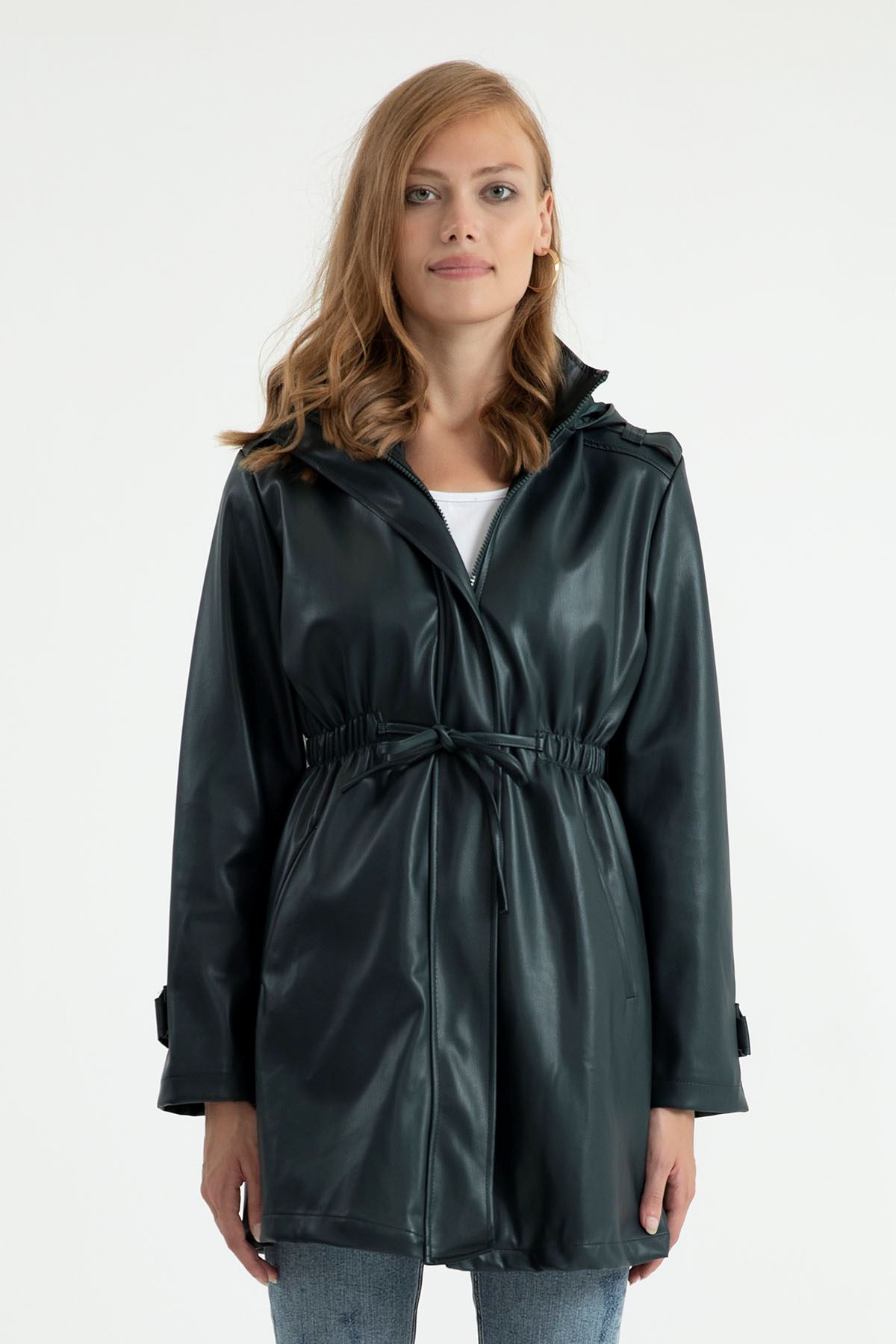 Suni Deri Kumaş Uzun Kol Fermuarlı Yaka Tam Kalıp Kadın Trençkot-Zümrüt Yeşil