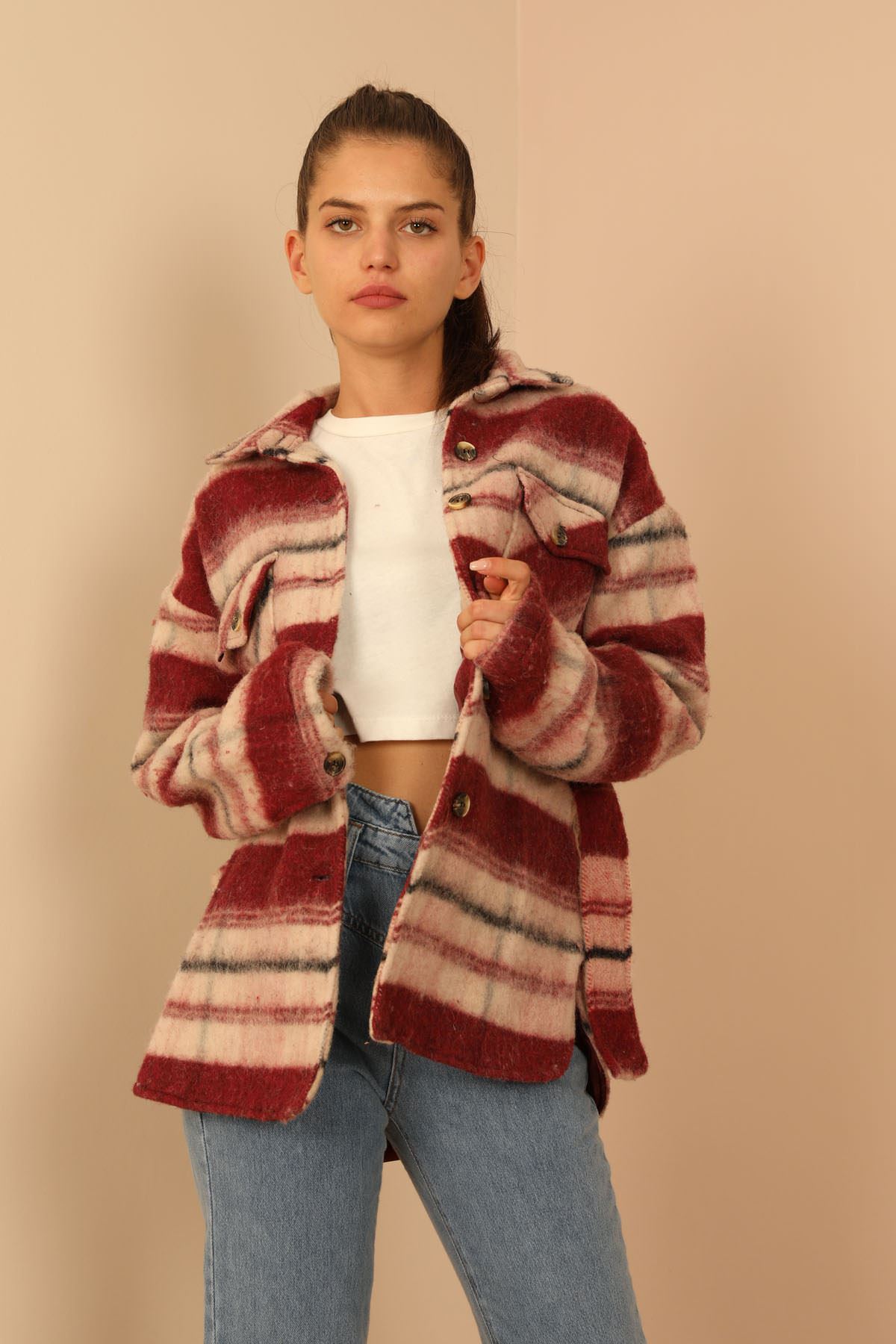 Kaşe Kumaş Uzun Kollu Tam Kalıp Kadın Kaban-Bordo