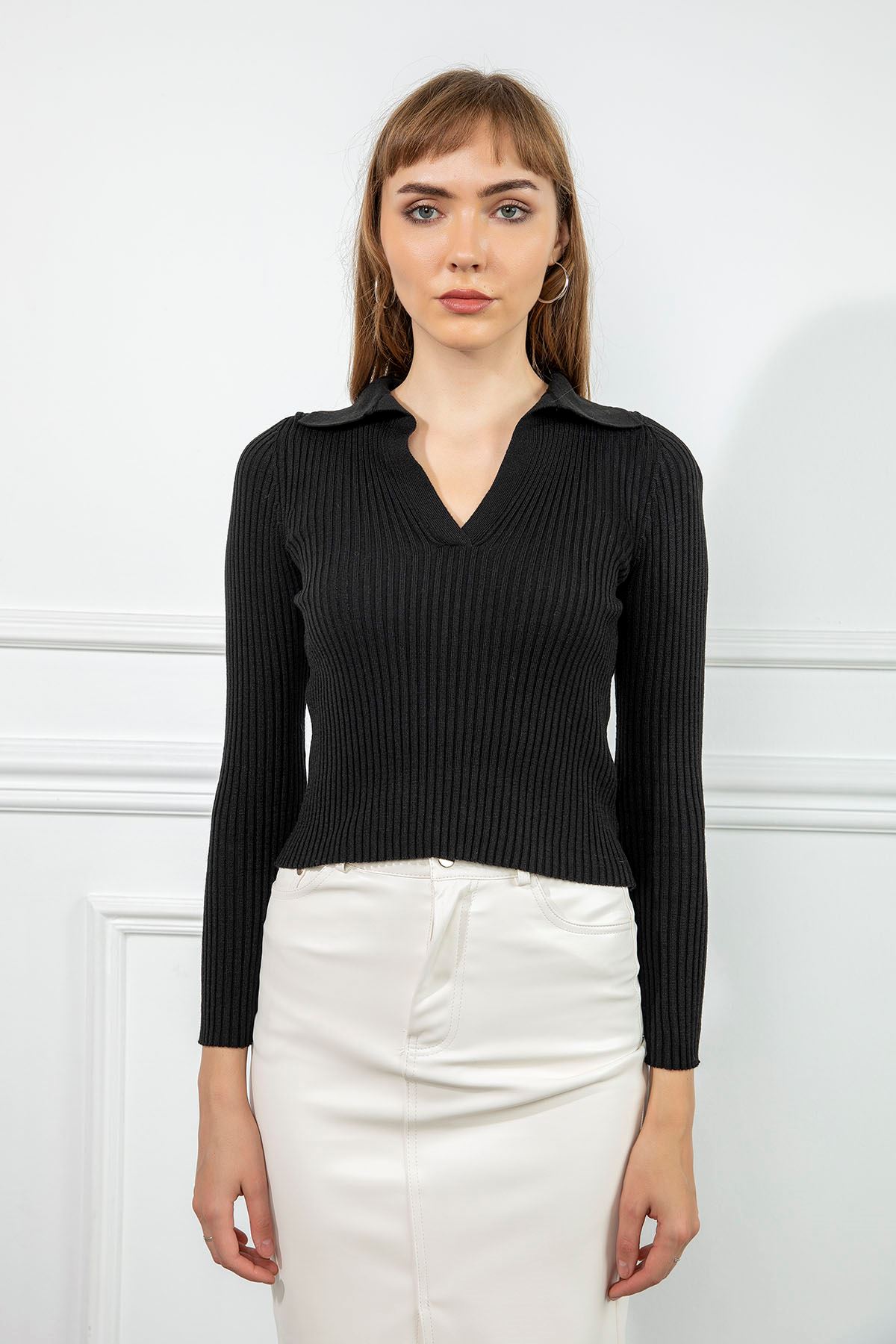 Triko Kumaş Uzun Kol Gömlek Yaka Dar Kalıp Kadın Kazak-Siyah